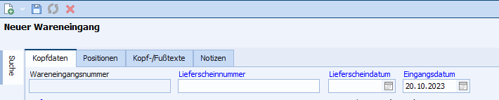 Dieser neue Wareneingang ist standardmäßig gekennzeichnet durch die vier Registerkarten: •"Kopfdaten", •"Positionen", •"Kopf-/Fußtexte" und •"Notizen".