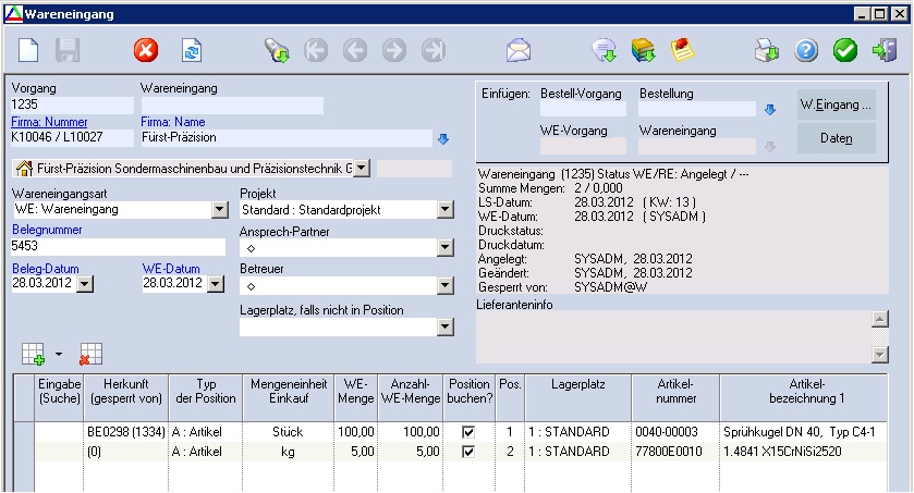 Wareneingangsnummer, wenn nach einem vorhandenen Vorgang gesucht werden soll. Über die Schaltfläche