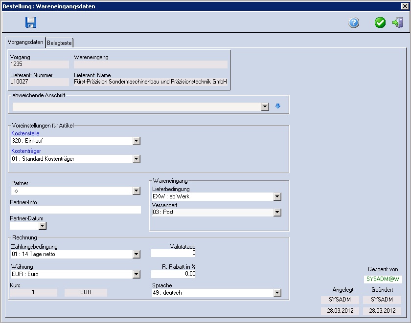 In die Felder "Bestell-Vorgang" und "Bestellung" kann direkt die Vorgangsnummer bzw. ID der zum Wareneingang gehörenden Bestellung eingegeben werden.