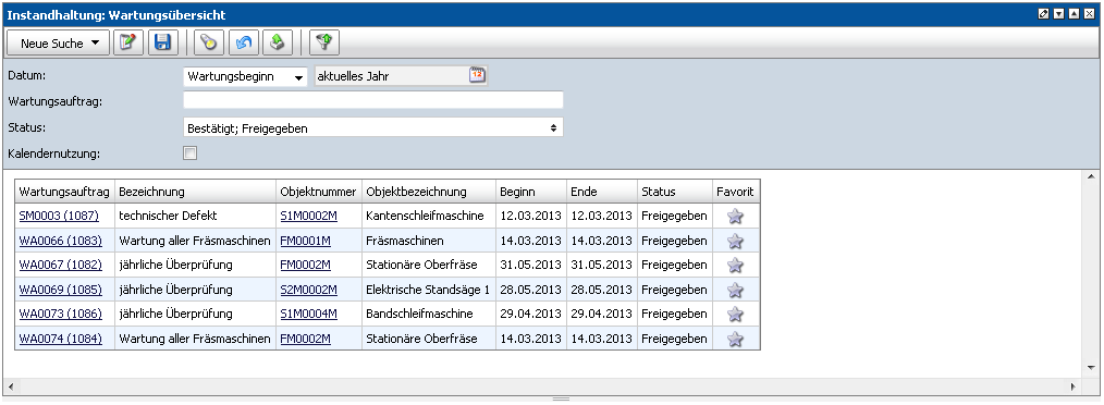 Das Portlet "Instandhaltung: Wartungsübersicht" zeigt alle Wartungsaufträge an.