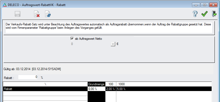 Es ist möglich, wertabhängige Auftragsrabatte zu verwalten. Übersteigt der Auftrag einen bestimmten Gesamtwarenwert, wird automatisch ein Rabatt gewährt.