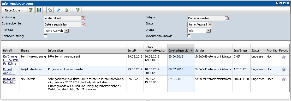 Das Portlet "Info: Wiedervorlagen" zeigt die empfangenen und gesendeten Wiedervorlagen des aktuell angemeldeten Nutzers an.