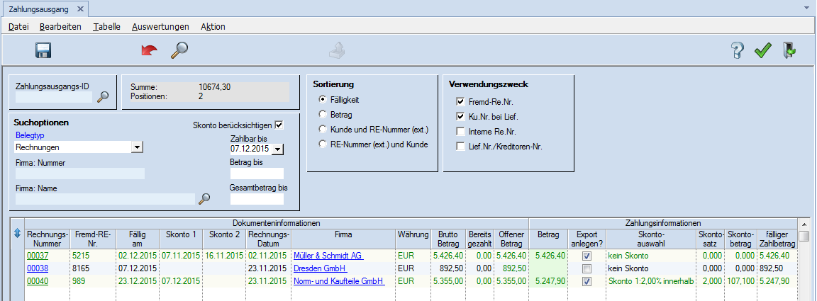 SkontoauswahlAnhand des angegebenen Zahlungsdatums wird der gültige Skontosatz ermittelt. In der Spalte "Skontoauswahl" werden "Kein Skonto", "Skonto 1", "Skonto 2" vorgeblendet. Es werden die laut Zahlungsbedingung gültigen Tage und Skontosätze angezeigt. Zudem ist die Verwendung eines abweichenden Skontosatzes/-betrages möglich. Dazu muss über das Auswahlfeld in der Spalte "Skontoauswahl" der Eintrag "Skonto manuell" gewählt werden. Damit ist das Bearbeiten der Spalten "Skontosatz"/"Skontobetrag" möglich.