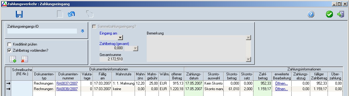 Es können Zahlungseingänge für berechnete Rechnungen und gebuchte Ausgangsgutschriften erfasst werden. Für Rechnungen sind die Behandlung von Skonto, Mahngebühren, Mahnzinsen, die Verrechnung von Gutschriften/Guthaben und die Verbuchung als uneinbringliche Forderung möglich.