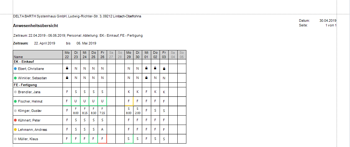 Anwesenheitsstatus, Nachname, Vorname des Mitarbeiters