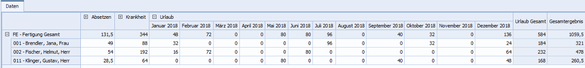 Fehlzeitenübersicht als PivottabelleIn der Pivottabelle sind die Mitarbeiter zusätzlich standardmäßig nach Abteilung gruppiert. Das Layout kann über den Eintrag "Layout anpassen" im Kontextmenü der Tabelle individuell angepasst werden.