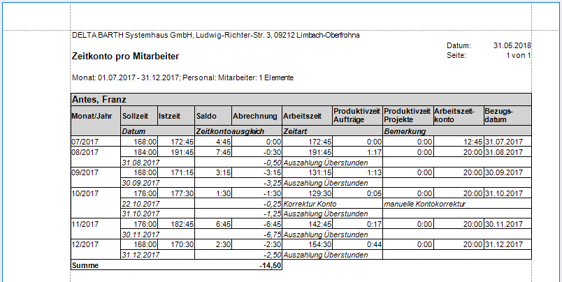 Stand des Arbeitszeitkontos zum Bezugsdatum