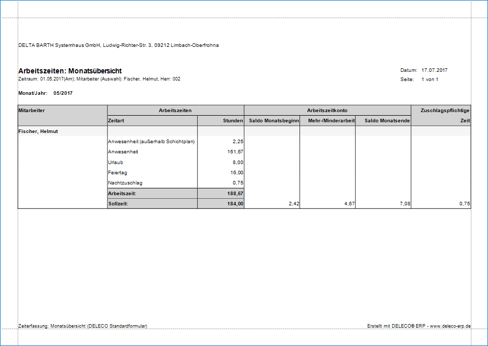 Die Auswertung "Monatsübersicht" zeigt die kumulierten Werte der Arbeitszeiten und den Stand des Arbeitszeitkontos eines Mitarbeiters pro Monat an.