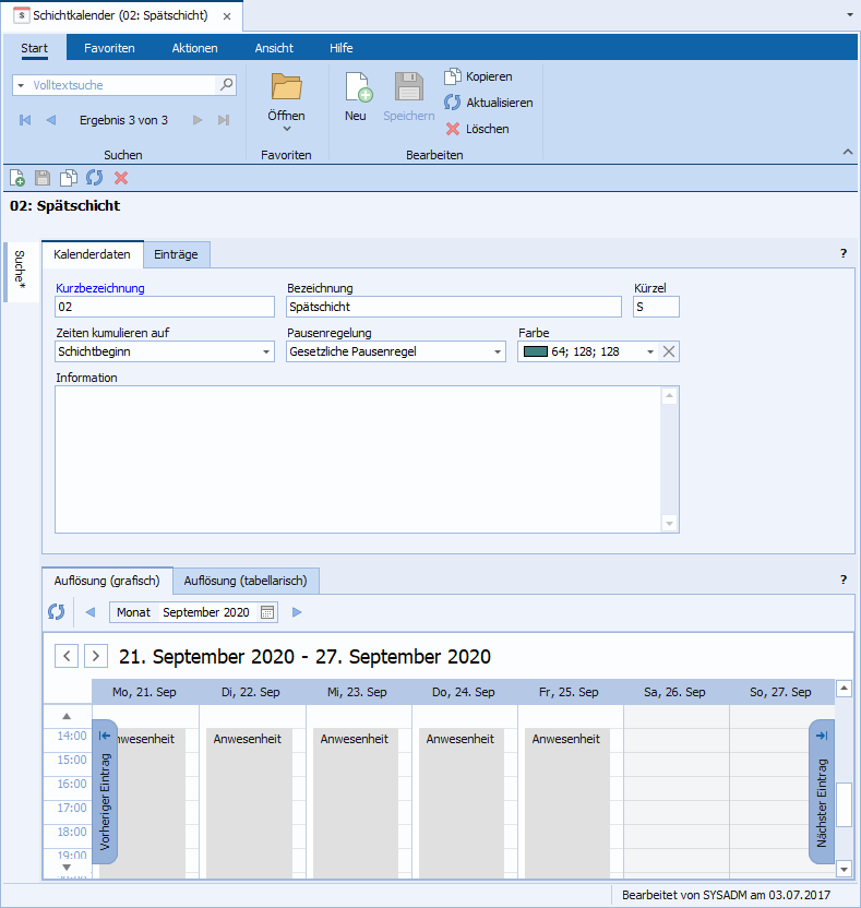 TitelbereichDer Titelbereich des Moduls beinhaltet Kurzbezeichnung und Bezeichnung des Schichtkalenders. Ist ein Schichtkalender gesperrt, wird ein entsprechender farblich hervorgehobener Hinweis angezeigt.