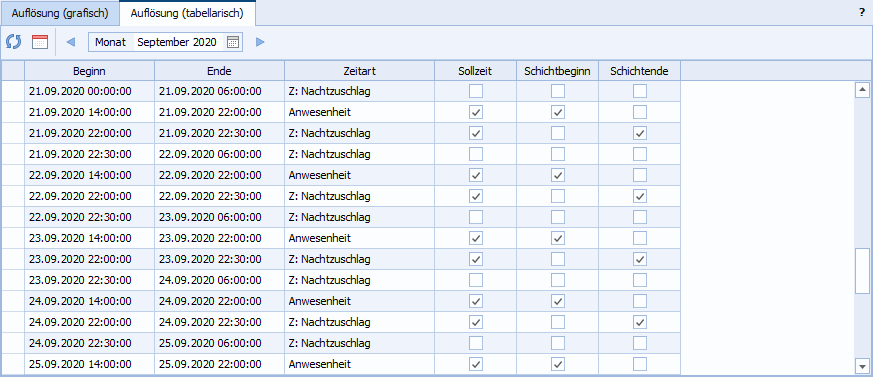 Aufruf: Modulgruppe Zeiterfassung - Modul Schichtkalender - Registerkarte Auflösung (tabellarisch)