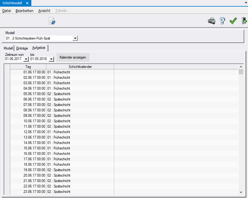 Auf der Registerkarte "Aufgelöst“ werden die Einträge des Schichtmodells für den ausgewählten Zeitraum dargestellt. Die Tabelle gibt einen Überblick, welcher Schichtkalender jeweils an den einzelnen Kalendertagen verwendet wird. Über die Datumsauswahl "Zeitraum von ... bis" wird der anzuzeigende Zeitbereich festgelegt.