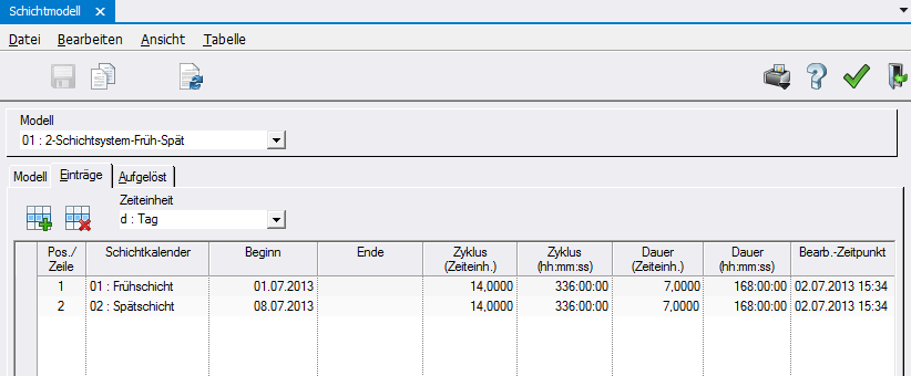 Das Schichtmodell bildet ein 2-Schichtsystem mit einer Früh- und einer Spätschicht ab. Die Frühschicht beginnt zum ersten Mal am 01.07.2013 und dauert 7 Tage an. Die Spätschicht beginnt zum ersten Mal am 08.07.2013 und hat ebenfalls eine Dauer von 7 Tagen. Es muss somit ein Zyklus von 14 Tagen für Schichten gewählt werden.